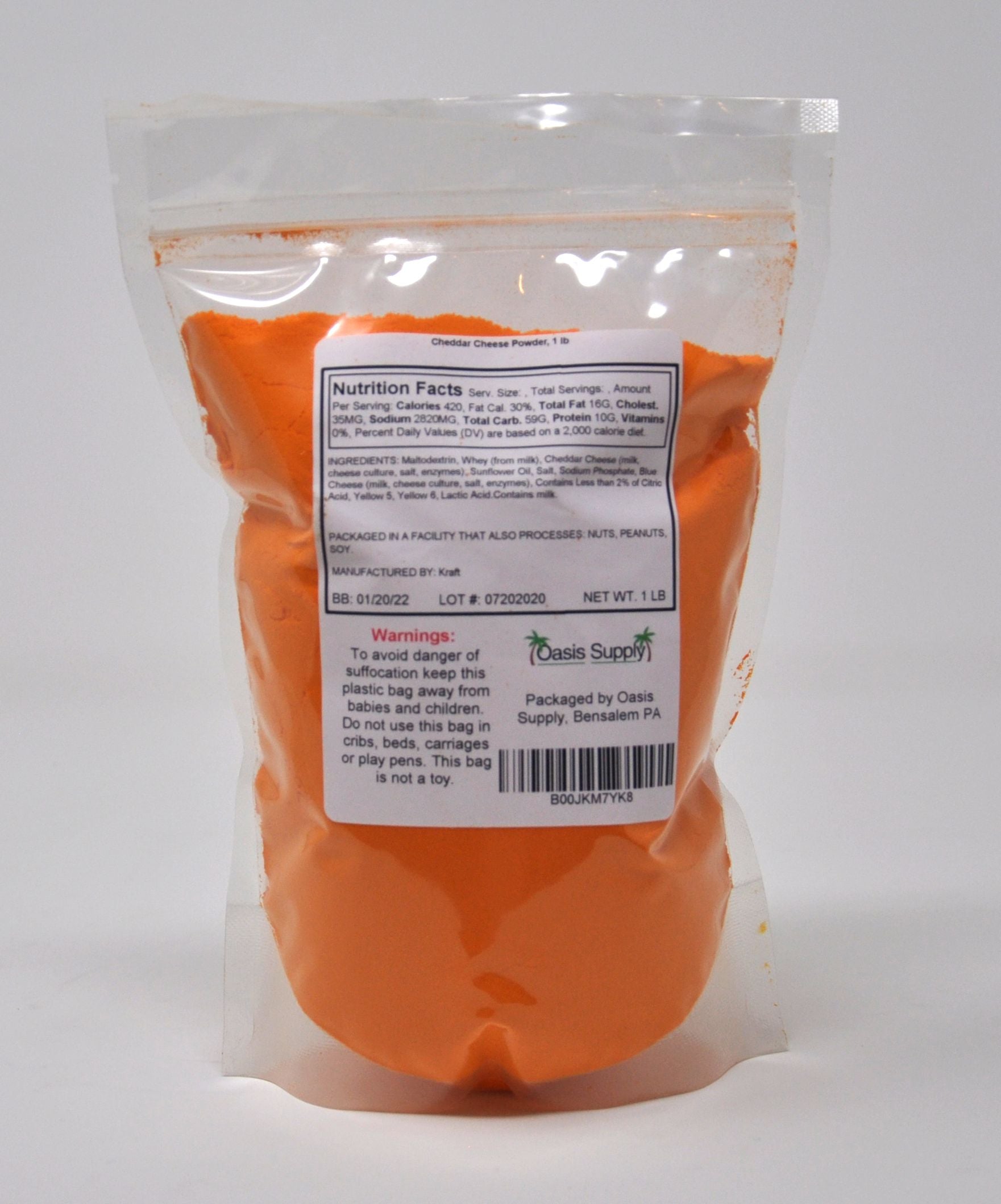 Cheddar Cheese Powder will add the delicious taste of cheddar to your snacks. This powder is perfect for sprinkling on popcorn, pretzels or any snack you desire. Cheddar Cheese Powder is also useful for baked potatoes, pastas and salads.