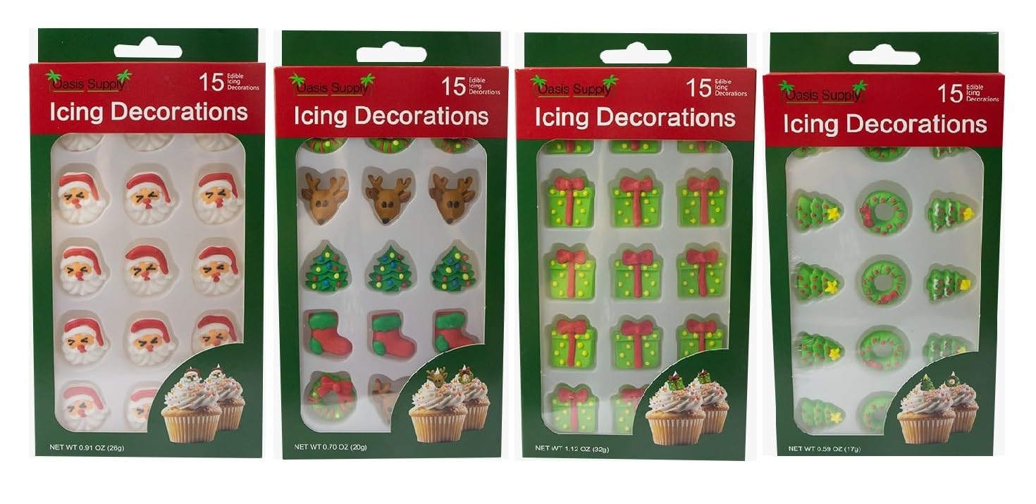 Christmas Edible Cake Decorations - Candy or Cupcake Topper - Santa Face, Trees, Wreaths, Reindeer, Xmas Boots, & Christmas Presents, 60 Pieces Total